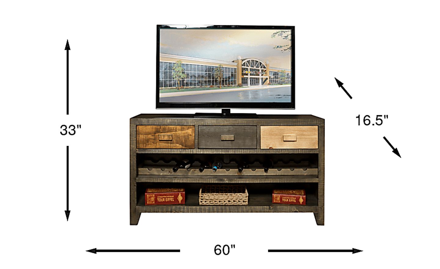 Store your wine in style with the Grove Town console. This rustic accent piece boasts three storage drawers with wood handles and slots for up to 11 bottles of wine. A lower shelf provides space for decorative items, books and more. Crafted of wood solids, the console has a multi-tone finish that varies in color including shades of gray, brown and natural.