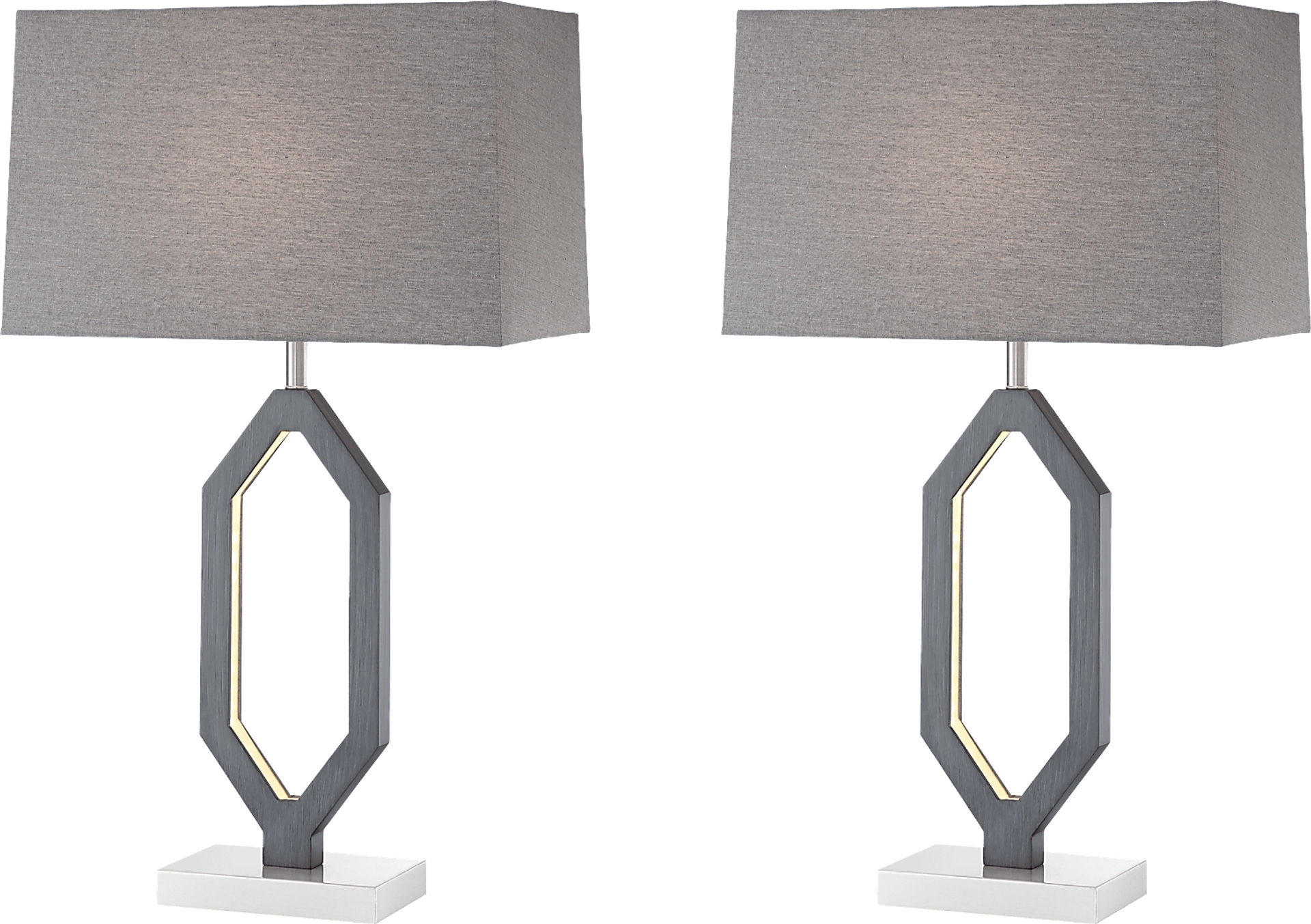 Brighten up your space with the contemporary flair of this set of two Guejito Gate lamps. Their gray-washed bodies feature an open geometric design. The rectangular shades top the pair in neutral gray. Each lamp has a built in 5-watt LED nightlight and accommodates up to a 100-watt bulb (not included).