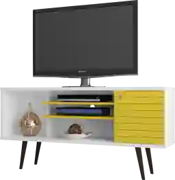 This media unit offers a versatile mix of open and closed storage to help organize your entertainment setup. It features one large open compartment for easy-access devices, three center shelves for media players or decor, and a hidden cubby tucked behind a single door. This configuration is ideal for stashing board games, controllers, and DVDs while keeping the overall look clean and clutter-free.