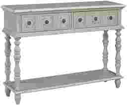 The Guilford Falls white sofa table boasts a weathered finish of the softest pale green. Its time-worn look is accented with hand-painted decorative elements on its drawer fronts. Inspired by apothecary designs, its two drawers have the look of six with individual pulls. A lower display shelf is perfect for storage while turned legs complete its unique character. Some customer assembly required.