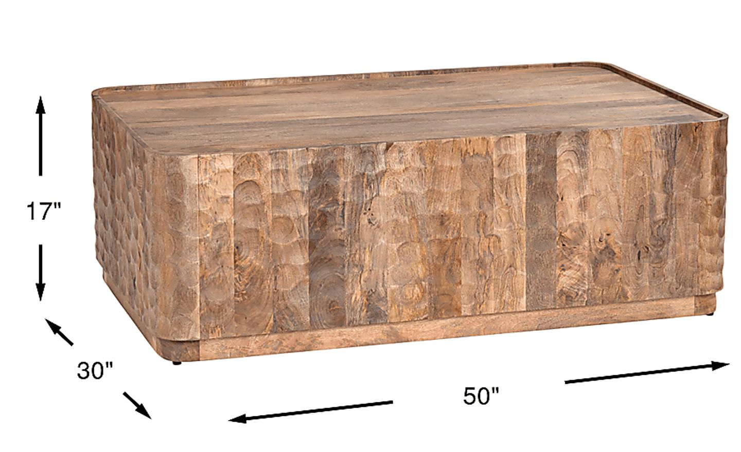 With a width of 50 inches, this rectangular cocktail table is ideally scaled for substantial seating arrangements. In professional interior design, the "2/3 rule" suggests a table should be roughly two-thirds the length of your sofa; this piece perfectly anchors sofas approximately 75 to 80 inches long. At 17 inches tall, it sits at a standard height that is comfortable for reaching from most modern sofa cushions.