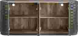 This credenza is specifically engineered for modern home entertainment systems. Behind its four flat-panel doors, you will find internal shelving designed to organize gaming consoles, cable boxes, and sound equipment. To maintain a clean and professional appearance, the unit features integrated pass-through holes on the rear panel, allowing you to route all cables directly to your power source while keeping them completely hidden from view.