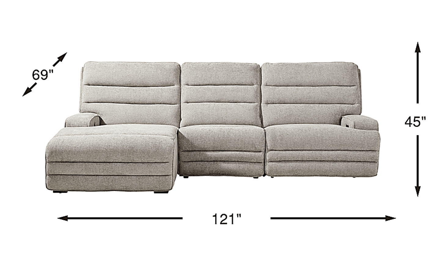 With a width of 121 inches and a depth of 69 inches, this sectional is a substantial piece designed for spacious living areas or open-concept homes. We recommend leaving at least 18 to 24 inches of walkway space around the unit to maintain a comfortable flow in the room. Because it features a zero-gravity reclining mechanism, it is engineered for efficient movement, but you should still ensure there is adequate clearance from the wall to allow the headrest and footrests to extend to their full length.