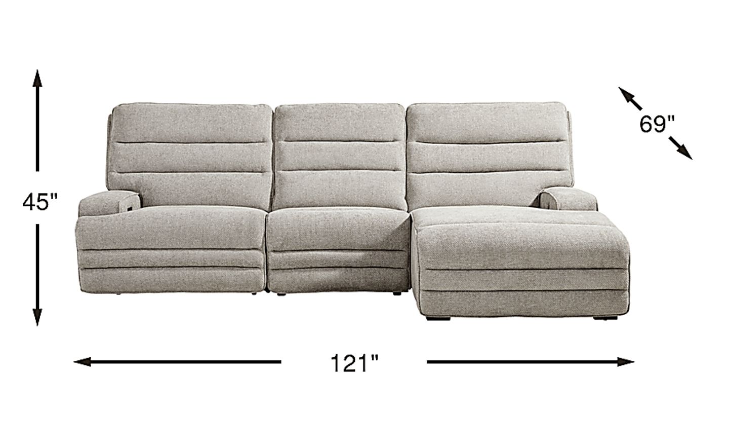 With a generous width of 121 inches and a depth of 69 inches, this 3-piece sectional is designed for spacious living areas. Because it features a power reclining mechanism, you should ensure there is adequate clearance between the back of the sofa and the wall to allow the seats to extend fully. Our delivery experts recommend measuring your entryways and the designated room area to ensure a seamless fit for this substantial piece.