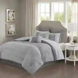 The Hafnor comforter set introduces a graceful elegance to your bedroom decor. A pieced embroidery design with quilting and pintuck details, in gray hues, adorns the face of the comforter and shams, for a beautiful transitional look. Solid Euro shams complement the top of the bed, while two embroidered decorative pillows and a solid bed skirt provide the perfect finishing touches to the bedding set. Made from ultra-soft microfiber, this comforter set is machine washable and offers a charming update to transform your bedroom. Customer assembly required.