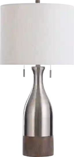 The contemporary Hague Shores lamp turns a familiar form into a piece of innovative art. A bottle-shaped base made of metal and polyresin gives way to a heathered linen shade in a classic drum. The resin features a faux-wood finish and a metal section colored with brushed steel, giving the fixture a two-tone look thats both rustic and classy. Partial assembly may be required.