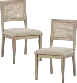 The Halleck dining chair set offers a charming urban farmhouse appeal to your dining decor. Featuring a cane inset back and an upholstered seat, this set of two dining chairs provides exceptional comfort and style around your dining table. The solid wood frame showcases a reclaimed wheat finish and classic mid-century styling, for a warm and natural look. Incorporate this dining side chair set into your dining room to give your space delightful and inviting touch. Customer assembly is required.