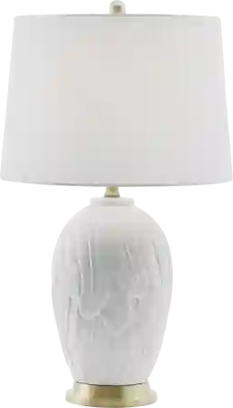 Complete an art deco-inspired theme with the artfully intriguing design of the feather-motif Halliford Trail lamp. This white ceramic lamp is topped with a clean white hardback drum shade while soft gold metal accents decorate its top and bottom. Partial assembly may be required.