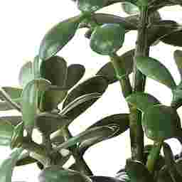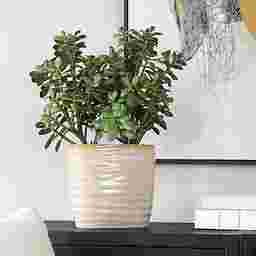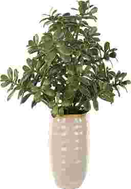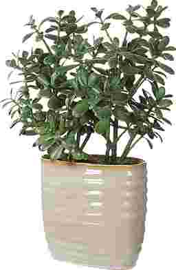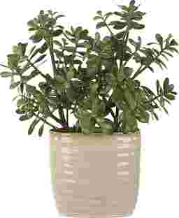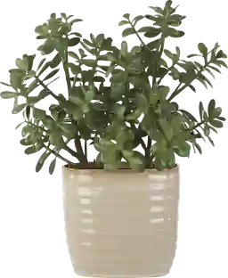 The Hallo plant brings life-like branches of jade billowing over a a textured tan, glazed ceramic pot.
