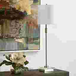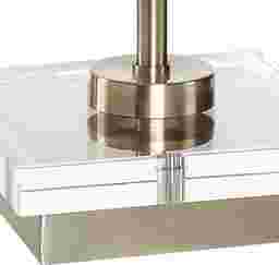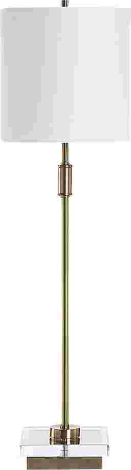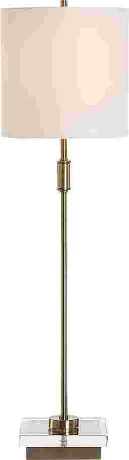 The simple Hammomd Creek Brass Lamp is finished in an antique brass. The slender body sits atop a crystal base and a round white linen shade completes the elegant look. Partial assembly may be required.