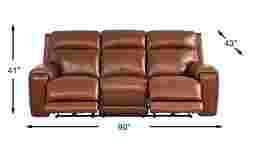 Rich with en vogue delights to tantalize and excite, the Hammond Park sofa launches party-ready, everyday cozy style into the spotlight. This contemporary piece is upholstered in brown top grain leather where the body touches, with top stitched seams throughout to create a luxurious tailored appearance. Hidden within each arm are cupholders with USB-A and USB-C chargers. Triple power reclining seats feature a zero gravity mechanism that positions the legs above the heart for incredible pressure relief. The lumbar supports, extended padded footrests and headrests are independently adjustable, and USB chargers are included on each control panel for the ultimate convenience. Upholstery: top grain leather where the body touches, polyurethane sides and back.