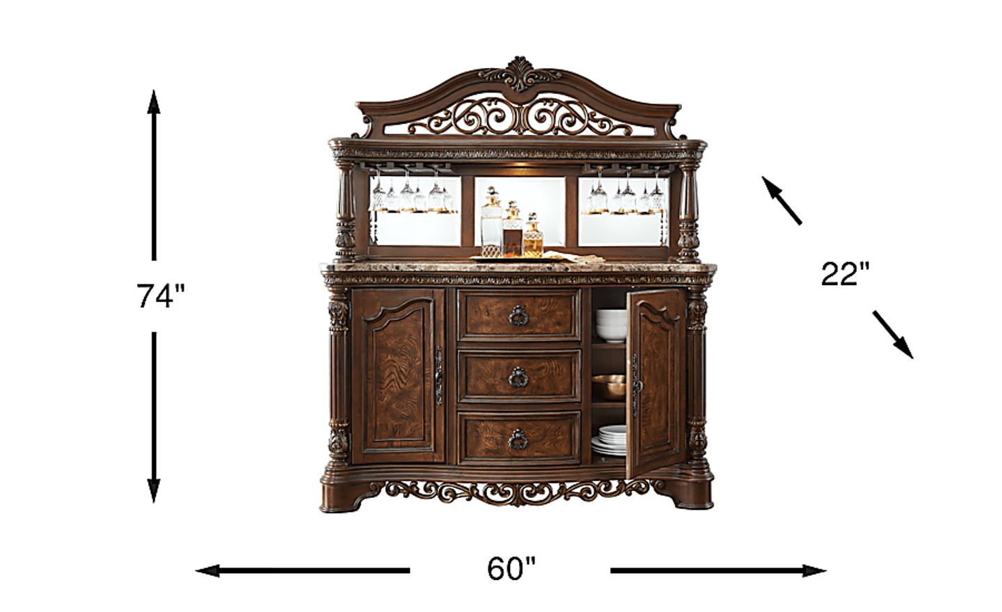 Complete your dining area with the gorgeously styled Handly Manor China cabinet. Adorned with elegant scrollwork, it makes a stunning statement that is sure to make guests look twice. Two touch lights on the upper hutch portion help to display your dishes and serving ware in its best light, with mirrored panels for added dimension. A stunning marble top on the lower server part is the perfect place to rest a tray of food during parties. For everyday storage, four shallow drawers are ideal for linens or silverware. Behind each of the two doors, you'll find an adjustable shelf that makes it simple to store and organize larger dishes. For added storage, a center wine rack can hold up to five bottles. Constructed of poplar solids with ash burl veneers in a warm pecan finish, each drawer and door is accented with ornate metal hardware.
