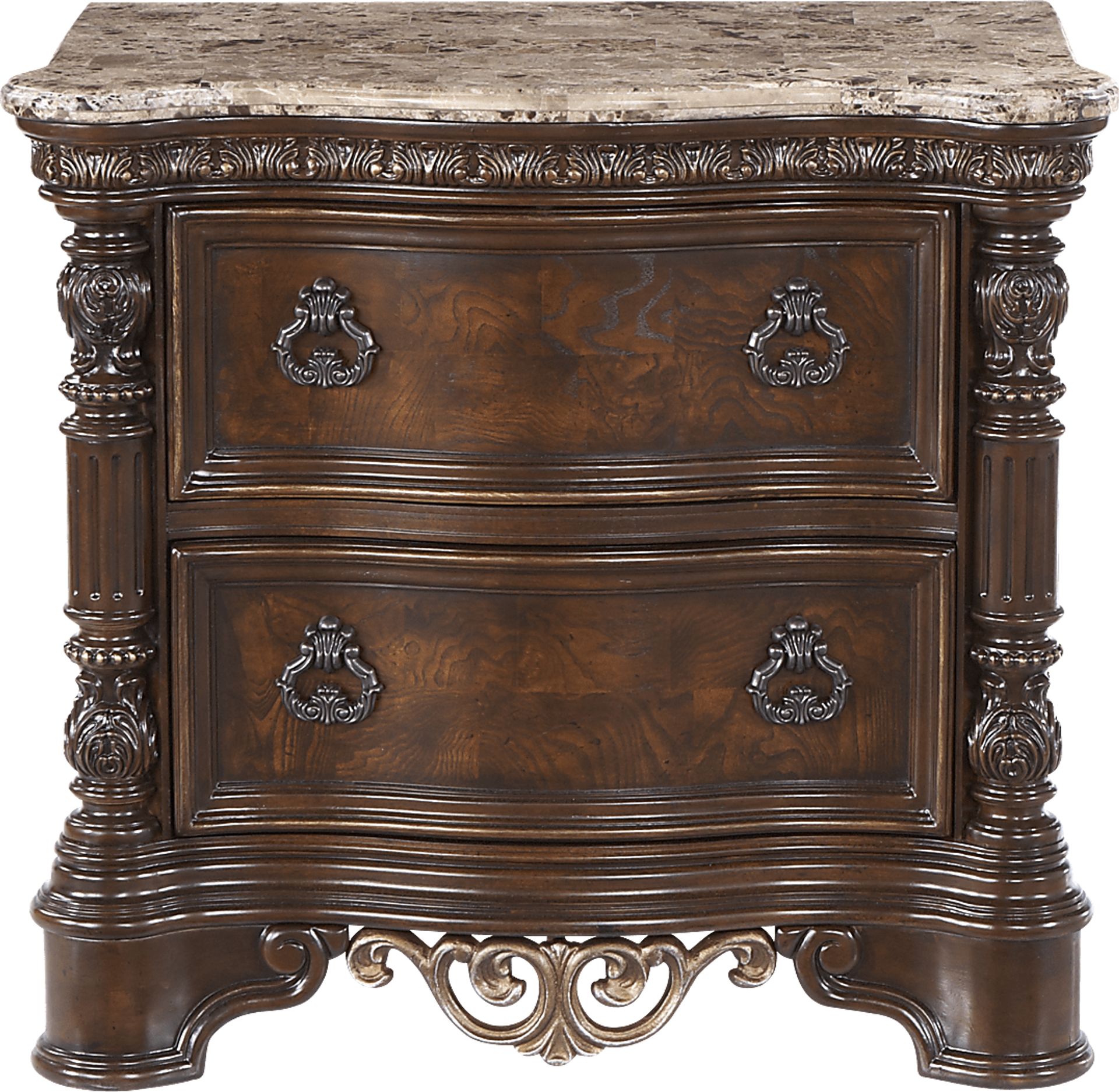 An elegant bedside necessity, the Handly Manor nightstand is handy for close-by storage and a beautiful piece of furniture as well. Featuring a gorgeously shaped marble top perfect for a vase or clock, two drawers offer plenty of storage for magazines, books, or anything else you would like close by. For an added dose of opulence, this nightstand features cast metal hardware and decorative cast metal scrollwork on the bottom.