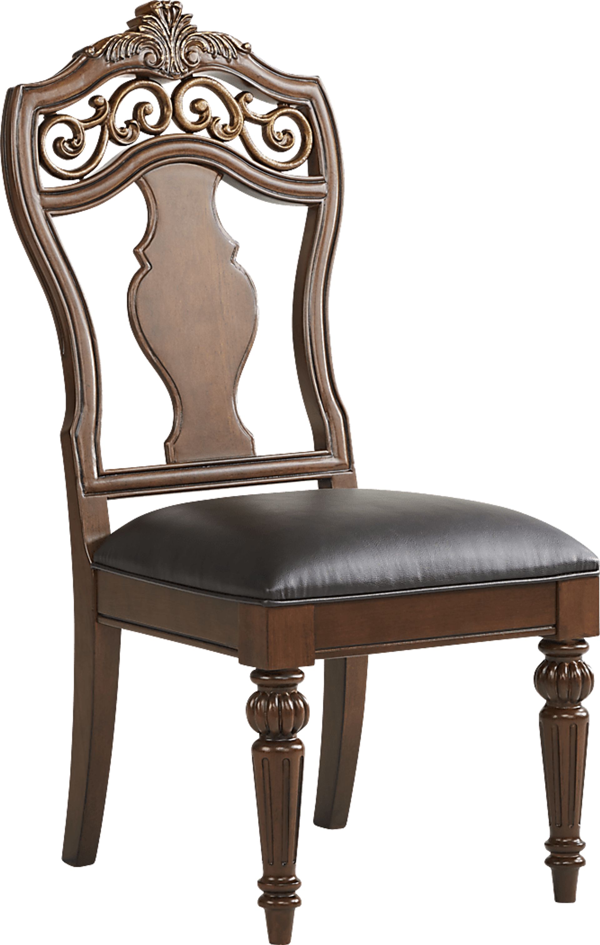 Graceful in its regal beauty, the Handly Manor side chair is an exceptional seating choice for your formal dining area. Constructed with ash burl veneers, a warm tobacco finish complements this gorgeous seat. Elegant scrollwork can be seen on the upper portion of the chair, with curved carvings on the wood back giving way to a stylish espresso-colored upholstered cushion ringed with nailhead trim. Two fluted column legs pair beautifully with the curved back legs, creating a side chair with a timelessly outstanding style.