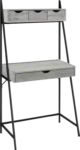 Absolutely. While the frame is built from sturdy black metal, the warm gray wood-look laminate and the contemporary ladder-leg silhouette give it a modern, refined aesthetic. The sleek cut-out drawer handles eliminate bulky hardware, allowing the piece to blend seamlessly into residential decor. It serves as an excellent multi-functional piece that looks just as appropriate in a hallway as it does in a dedicated office.