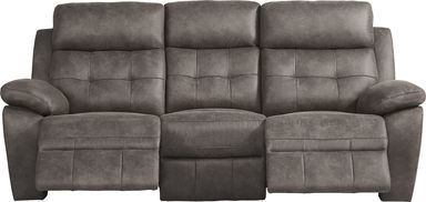 The Hanton Heights Slate Reclining Sofa features a non-power reclining mechanism. This means that to recline, you typically engage a lever or handle, which then allows you to smoothly lean back and extend the padded chaise footrests for ultimate comfort.