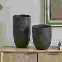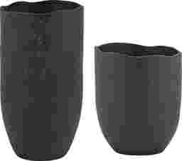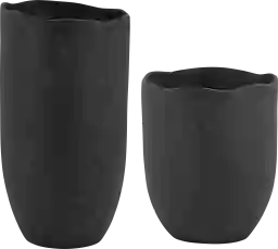This set of two Haoli earthenware vases features a striking matte black finish with a rich, rustic texture. Their unique, organic shape and subtle waved rim add a touch of handcrafted artistry to any space. Safe for outdoor use, but protection from freezing temperatures is recommended. Sizes: S-10x12x10, L-9x17x9