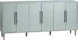 Transform your space with the Happyking green sideboard in a relaxing smooth seafoam green painted finish. The six doors, featuring European hinges and oversized brushed nickel bar handles, offer a blend of elegance and modern functionality. Inside, three fixed shelves provide ample storage, while cord management holes keep cables tidy. Tapered legs and adjustable levelers ensure stability. Customer assembly is required.