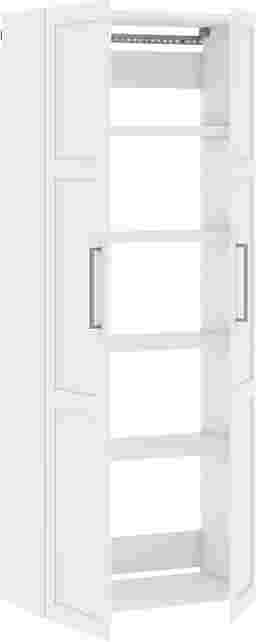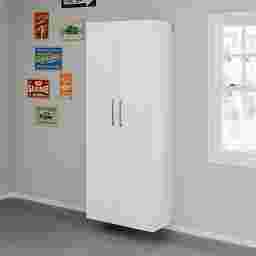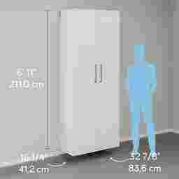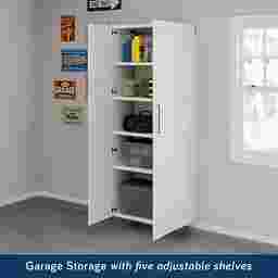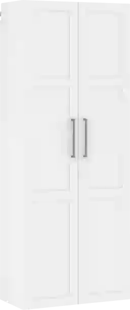 Create an inviting and functional home extension with the Happyworks I white storage cabinet. This wall-mounted storage cabinet with doors is 15.5-inches deep and features five adjustable shelves for optimal organization space. With 1.25 inch thick, strong and lightweight panel construction, each shelf holds up to 60 pounds. This tall storage cabinet mounts securely to the wall with a metal rail system and cabinet braces, providing a professionally installed look that ensures easy cleaning underneath, in addition to protection from water and debris. The surface of this storage cabinet with doors is heat, stain, and scratch-resistant, making it ideally resilient for a more rugged atmosphere. The bottom shelf of this storage cabinet can be raised or removed to accommodate heavier items on the floor. Easily create hidden storage that makes spaces more visually pleasing, with the addition of these resilient and rugged cabinet doors. Customer assembly is required.