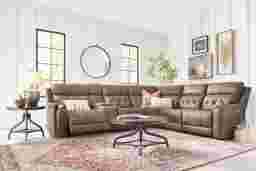 Cozy and comfortable combines with a sophisticated jazz swing that gives the Hardwick dual power sectional a unique blend of styles that are perfect for any room. Contemporary in style with soft brown upholstery, this sectional features a luxurious button-tufted look with diamond patterned welted seams accompanied by comfortable padded arms, chaise padded footrests and single attached seat and back cushions for ultimate leisure and relaxation. Dual power, touch button reclining options allow for headrest and footrest adjustment while USB charging ports on the power panel keep your favorite electronics charged and ready for use. The sectional's console also includes USB charging ports as well as a wireless charging pad and hidden storage compartment with abundant room for remotes and other living room necessities. A pull-out cupholder tray is the finishing touch to put everything you need for easy convenience in arms reach. Upholstery: 100% Polyester.