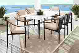 Harlowe Black 7 Pc Outdoor Rectangle Dining Set With Flax Cushions