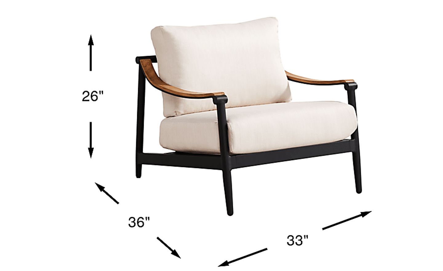Cool, modern confidence radiates from the swooping curves of the Harlowe club chair from Cindy Crawford Home to create a space where connection and relaxation stretch long, long, long into the night. The deep slant of this seat promises indulgent luxury, while the tailored cushions in UV-resistant flax colored Sunbrella fabric offer added support and style. A weather-resistant aluminum frame in black is accented with sloped arms topped in teak, all standing on smooth tapered legs and back posts. To clean Sunbrella fabric cushions remove dirt and spray on cleaning solution (water and mild soap), then use a soft bristle brush or sponge. Allow cleaning solution to soak into fabric and rinse thoroughly until soap residue is removed. Air dry. Do not dry clean.