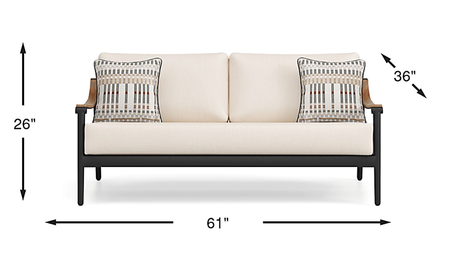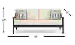 Cool, modern confidence radiates from the swooping curves of the Harlowe loveseat to create a space where connection and relaxation stretch long, long, long into the night. The deep slant of this seat promises indulgent luxury, while the tailored cushions in UV-resistant flax colored Sunbrella fabric offer added support and style. A weather-resistant aluminum frame in black is accented with sloped arms topped in teak, all standing on smooth tapered legs and back posts. To clean Sunbrella fabric cushions remove dirt and spray on cleaning solution (water and mild soap), then use a soft bristle brush or sponge. Allow cleaning solution to soak into fabric and rinse thoroughly until soap residue is removed. Air dry. Do not dry clean.