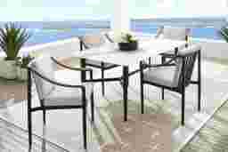 Cool, modern confidence radiates from the sweeping lines of the Harlowe dining table from Cindy Crawford Home to create a space where connection and relaxation stretch long, long, long into the night. A weather-resistant aluminum frame in black is accented with smooth tapered legs and cross support. A rectangular sintered stone tabletop in a marble pattern completes the look.