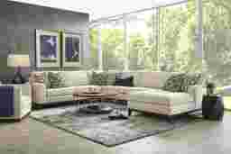 With the fine tailored look of an Italian suit and the richness of unlimited leisure, the Harmon beige sectional makes your living room a luxury destination. Featuring soft jacquard fabric in a soothing beige, this modern collection boasts loose, button tufted seat cushions for easy comfort and sharp style on the sofa and loveseat while a single attached cushion with all the same elements will make the chaise your favorite place to while away the hours with your favorite relaxation pastime. Its wedge-shaped arms provide a debonair touch of class while feather blend pillows are a penthouse elevator to Cloud 9. Warm brown framing and feet provides a perfectly fashionable visual contrast. Upholstery: 100% Polyester.