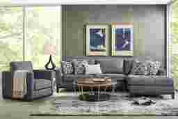 With the fine tailored look of an Italian suit and the richness of unlimited leisure, the Harmon beige sectional makes your living room a luxury destination. Featuring soft jacquard fabric in a soothing indigo, this modern collection boasts loose, button tufted seat cushions for easy comfort and sharp style on the loveseat while a single attached cushion with all the same elements will make the chaise your favorite place to while away the hours with your favorite relaxation pastime. Its wedge-shaped arms provide a debonair touch of class while feather blend pillows are a penthouse elevator to Cloud 9. Warm brown framing and feet provides a perfectly fashionable visual contrast. Upholstery: 100% Polyester.