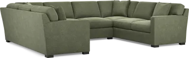 The avocado green chenille is a versatile contemporary neutral that gains depth from the fabric’s natural sheen. In bright, sun-drenched rooms, the feather-blend cushions and top-stitched seams are accentuated, highlighting the Cindy Crawford Home tailored aesthetic. In softer, evening light, the rich green hue provides a warm, grounding presence that pairs well with a variety of wood finishes and metal accents.
