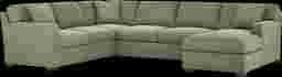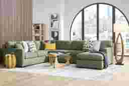 Slow mornings of easy relaxation. Everyday moments of warmth and connection. Lively gatherings flowing effortlessly into the evening. The Harmonie collection from Cindy Crawford Home is there for it all, rising to every occasion with luxurious comfort and elevated form. Wrapped in family-friendly avocado green chenille, this do-it-all sectional offers a perfect blend of versatile function and contemporary style. Refined track arms and top-stitched seams showcase a timeless tailored look that fits beautifully into any home. Gracefully curved, loose cushions are filled with a custom blend of feathers, fiber and down surrounding a supportive foam core for comfort that's soft yet structured. Matching toss pillows at each corner adds a touch of softness, while black block legs provide a subtle contrast to ground the ensemble. Upholstery: 100% Polyester.
