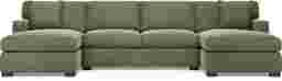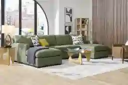 Avocado is a versatile earth tone that anchors a room with warmth. In large, sun-drenched living areas, our design experts suggest pairing this green upholstery with light neutrals like cream, beige, or soft gray to maintain an airy feel. To enhance the contemporary aesthetic, integrate natural wood textures and metallic accents such as black iron or brass, which complement the sectional's black block legs and top-stitched seams.