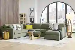 Part of the Cindy Crawford Home collection, the avocado green upholstery serves as a sophisticated and vibrant focal point. To enhance its contemporary look, we recommend pairing it with neutral tones like cream or gray to let the color pop. For a more organic, grounded atmosphere, integrate earthy textures like wooden coffee tables or natural fiber rugs, which complement the soft texture of the chenille.