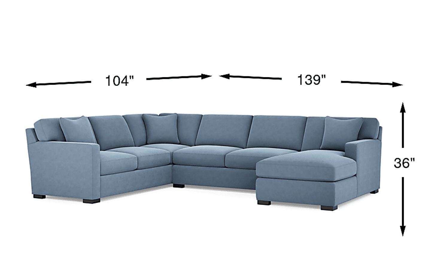 To determine if this sectional fits your space, start by measuring your primary wall; the 139-inch width typically works best in rooms where the sofa occupies roughly two-thirds of the available wall length. Additionally, account for the 104-inch depth of the chaise. Our experts recommend maintaining 18 to 24 inches of walkway space around the unit to ensure a comfortable flow. Because this is a large 3-piece set, we also suggest measuring your doorways and hallways against the 36-inch height to confirm a smooth delivery and setup.