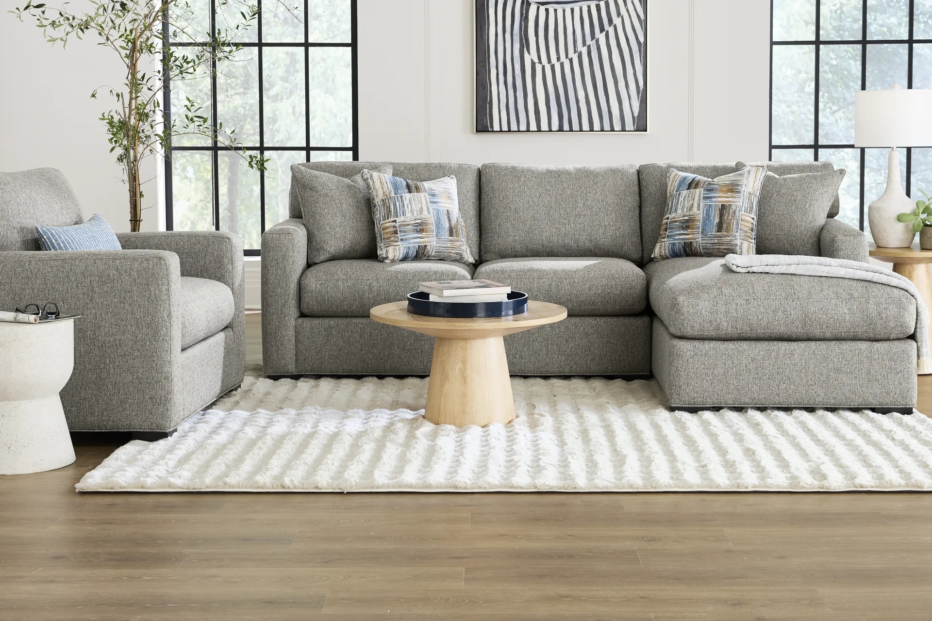Slow mornings of easy relaxation. Everyday moments of warmth and connection. Lively gatherings flowing effortlessly into the evening. The Harmonie collection from Cindy Crawford Home is there for it all, rising to every occasion with luxurious comfort and elevated form. Wrapped in family-friendly stone-gray woven fabric, this do-it-all sectional offers a perfect blend of versatile function and contemporary style. Refined track arms and top-stitched seams showcase a timeless tailored look that fits beautifully into any home. Gracefully curved, loose cushions are filled with a custom blend of feathers, fiber and down surrounding a supportive foam core for comfort that's soft yet structured. Matching toss pillows at each corner adds a touch of softness, while black block legs provide a subtle contrast to ground the ensemble. Upholstery: 100% Polyester.