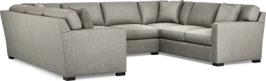 This sectional utilizes a premium seating construction consisting of a supportive foam core surrounded by a custom blend of feathers, fiber, and down. This design provides an luxurious "sink-in" comfort while the foam core ensures the cushions maintain their structured, contemporary shape over time, preventing the "pancaking" common in fiber-only furniture.