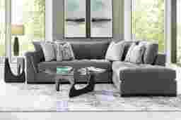 From spending time with family to cuddling up with your favorite novel, the Harper sectional from Cindy Crawford Home transforms the space you spend so much time in into a world of peace and tranquility. Designed with a sleek, contemporary appearance, this piece features eye catching angled arms and tufted bench-style seat cushions and is upholstered with steel fabric that has a soft, velvety texture. Woodblock legs finished in a dark color ground the overall look with a sumptuous prestige. The sectional's right arm facing chaise and left arm facing loveseat come with matching toss pillows that add an extra flourish of upscale uniformity to the piece. Upholstery: 100% Polyester. Accent pillows not included.