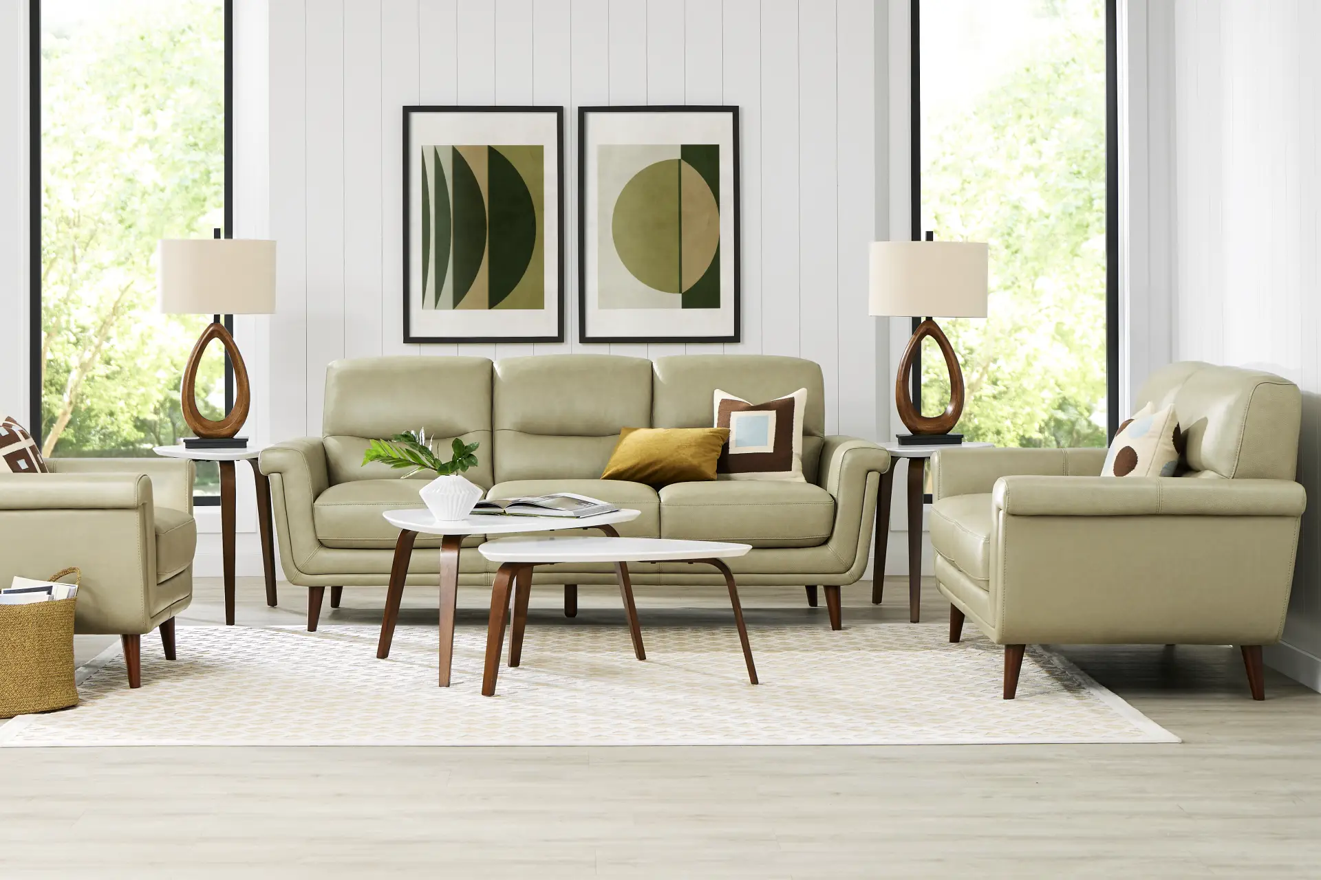 Has a walk in the park has ever been as elegant and stylish as the Harrington Park living room's gorgeous top grain leather and sophisticated lines and curves? This transitional collection in a sage color features padded outside arms and backs as well as contoured mailbox arms for an utterly handsome silhouette. Attached seat cushions are accompanied by attached back cushions replete with welting for the perfect cosmopolitan touch. Tapered square leg with a warm brown finish provide the final touch for a luxurious trip into your own personal relaxation station. Upholstery: Top grain leather where the body touches and polyurethane fabric sides and backs. Leather is a durable, low maintenance product, however, general regular maintenance is necessary. To keep your leather clean, vacuum it regularly, removing any dust, and clean it with water and a mild non-detergent soap. Accent pillows not included. Lamps not as shown in room image.