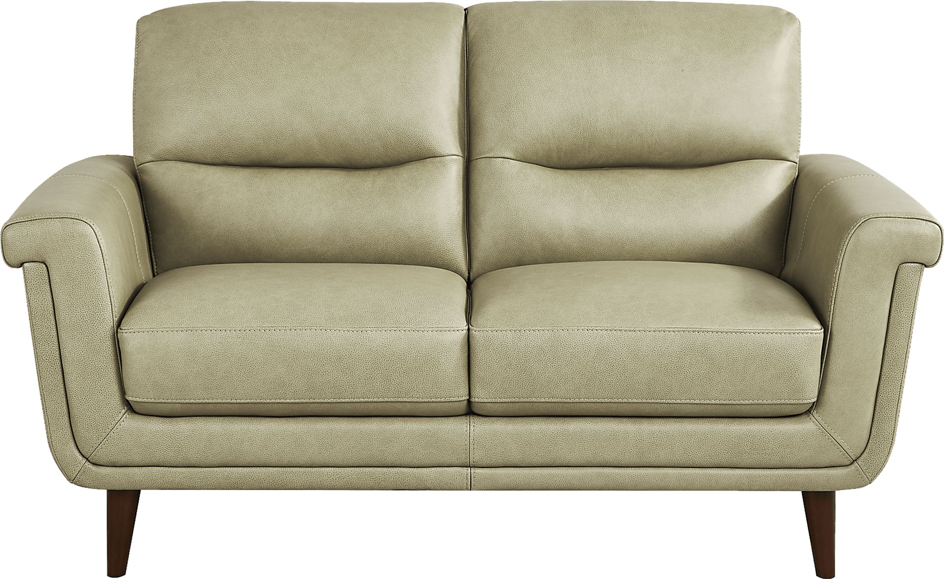 Has a walk in the park has ever been as elegant and stylish as the Harrington Park loveseat's gorgeous top grain leather and sophisticated lines and curves? This transitional piece in a sage color features padded outside arms and backs as well as contoured mailbox arms for an utterly handsome silhouette. Attached seat cushions are accompanied by attached back cushions replete with welting for the perfect cosmopolitan touch. Tapered square leg with a warm brown finish provide the final touch for a luxurious trip into your own personal relaxation station. Upholstery: Top grain leather where the body touches and polyurethane fabric sides and backs. Leather is a durable, low maintenance product, however, general regular maintenance is necessary. To keep your leather clean, vacuum it regularly, removing any dust, and clean it with water and a mild non-detergent soap.