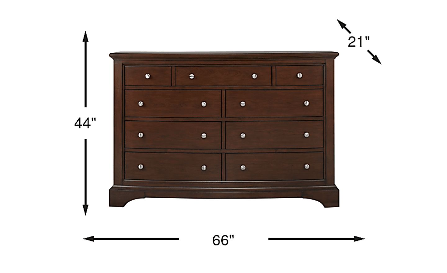 Clean lines and tastefully understated styling make the Harrington Place dresser a fantastic choice. Crafted of pine solids with beautiful cherry veneers and a brown cherry finish, this is a striking bedroom essential. Nine drawers offer generous storage capacity. Brushed nickel knobs provide a complementary contrast to the rich finish.