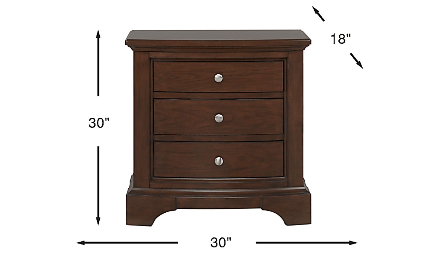 Keep all of your bedside essentials close at hand with the Harrington Place nightstand. This delightful piece has triple storage drawers for convenient bed side storage. Made of pine solids with cherry veneers, the brown cherry finish is complemented by brushed nickel hardware.