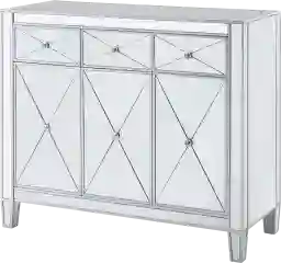Mirrored from every angle, this Harrisglen storage cabinet reflects your glamorous side. This mirrored sideboard contains three top drawers and three spacious cabinets below for a maximum amount of concealed organization. Chic details, such as crystal knobs, scored mirrors, and matte silver trim evoke Hollywood regency opulence. An elegant chest for a dining or living room, this mirrored cabinet also doubles as a bar station in your entertaining spaces. Customer assembly is required.