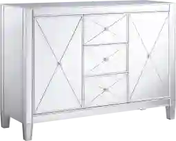 Reflect your glamorous side. Bathed in glistening silver from head to toe, this Harrisglen storage cabinet contains three stacked drawers and two spacious cabinets for a maximum amount of concealed organization. Chic details, such as crystal knobs,scored mirrors, and matte silver trim evoke Hollywood regency opulence. Add this elegant chest to your dining or living room and let your style stand out. Customer assembly is required.