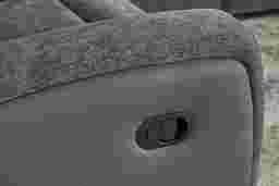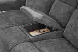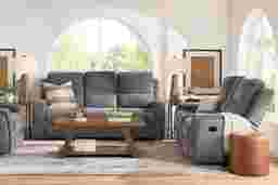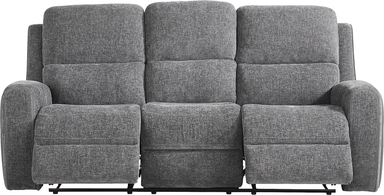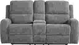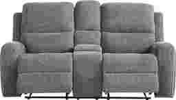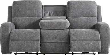 As the quiet evening transforms into moments to unwind, the Harrison collection creates a soothing retreat with sculpted curves and sink-in comfort. Contemporary in style and wrapped in soft woven fabric, this beautiful charcoal gray sofa features top-stitched seams that trace each pillowy contour with tailored precision. Recline effortlessly with a pull of a handle for further relaxation. A center fold down table adds thoughtful function to its refined design, offering convenient cupholders and storage pockets for everyday ease. Upholstery: 95% Polyester, 5% Polyurethane.