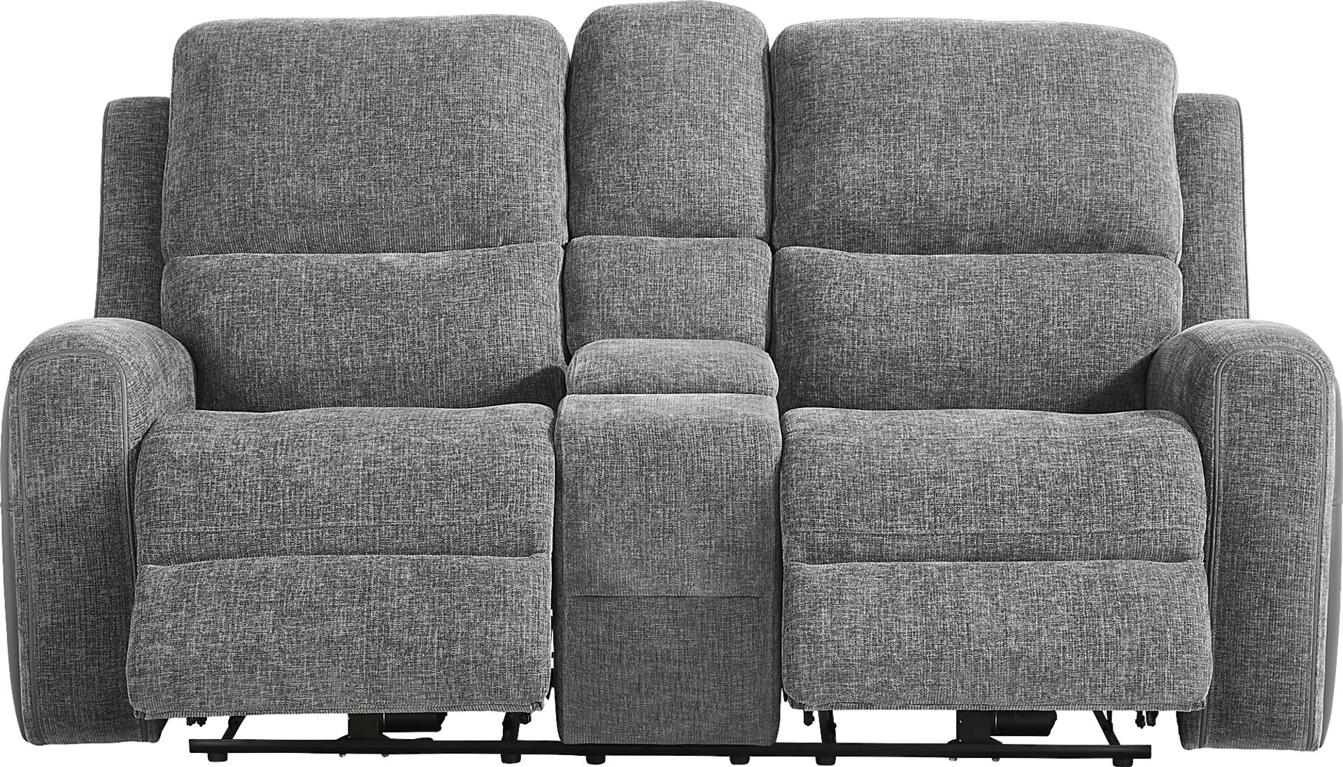 As the quiet evening transforms into moments to unwind, the Harrison collection creates a soothing retreat with sculpted curves and sink-in comfort. Contemporary in style and wrapped in soft woven fabric, this beautiful charcoal gray loveseat features top-stitched seams that trace each pillowy contour with tailored precision. Dual-power reclining provides personalized relaxation with adjustable footrests and headrests, while built-in USB charging ports are seamlessly integrated into the arm controls. A center console adds thoughtful function to its refined design, offering hidden cupholders and a storage compartment for everyday ease. Upholstery: 95% Polyester, 5% Polyurethane.