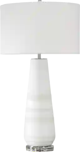 The Hart Edge White Lamp showcases a crackled white ceramic base with heavily textured dove gray bands for a touch of earthy elegance. Resting on a thick crystal foot and accented with brushed plated nickel finishes, this lamp brings a serene sophistication to any room. The round drum shade is covered in a crisp white linen fabric. Due to the nature of fired glazes on ceramic lamps, finishes will vary slightly. Partial assembly may be required.