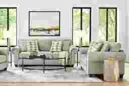 Includes:bluestone sofa • bluestone loveseat • Cocktail Table + 2 End Tables • gray lamp (2)