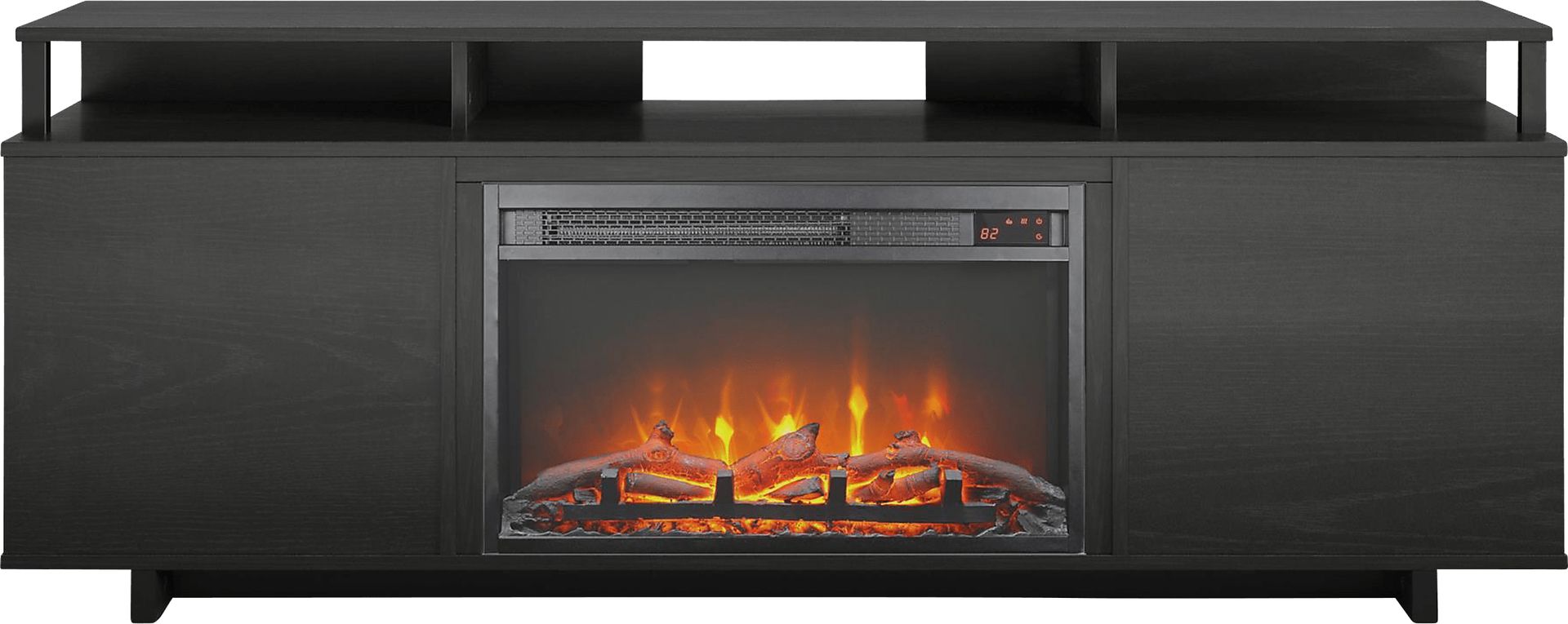 Upgrade your entertainment space with the Haugo console. This console can accommodate TVs up to 65 wide or 120 lbs. The black oak finish and metal accents give the console a modern, updated feel. The 23 electric fireplace insert features a realistic flame effect that can be used with or without heat. Use the remote control or touch panel to adjust the various flame and heat settings so your room is always comfortable. The insert plugs into a standard 120V outlet and heats a room up to 400 square feet. The divided top shelf is perfect for your cable box, audio equipment, and gaming consoles and features an open back to make plugging in devices easy. Organize your DVD and game collection on the 4 open side storage shelves to have easy access to your games and movies. Customer assembly required.