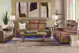 Ease into relaxation mode in a room full of life's finer comforts with the Haven Point collection, your ultimate lounge destination with ultra convenience wrapped in a luxurious look. Requiring just 3.5 inches from a wall to fully recline, this contemporary set of wall huggers features zero gravity reclining tech with power adjustable head and footrests. The panels have easy-to-use controls and even include USB-A and USB-C charging ports to juice up your favorite personal devices. The fold-down cupholder tray enhances your seating experience with wireless charging, reading lights and storage. The sofa's armrests have lighted cupholders and even more storage. The coordinating loveseat has a console of its very own with center storage. Upholstered with durable, silky-smooth saddle brown microfiber, the sofa and loveseat's look is highlighted by top stitching alongside seams with contrast welting. Ambient blue base rail lighting finishes off the look with a sleek final touch. Upholstery: 85% Polyester, 15% Polyurethane. Cleaning Instructions: Use water based cleaning agents or foam. Tables not as shown in room image. Accent pillows not included.